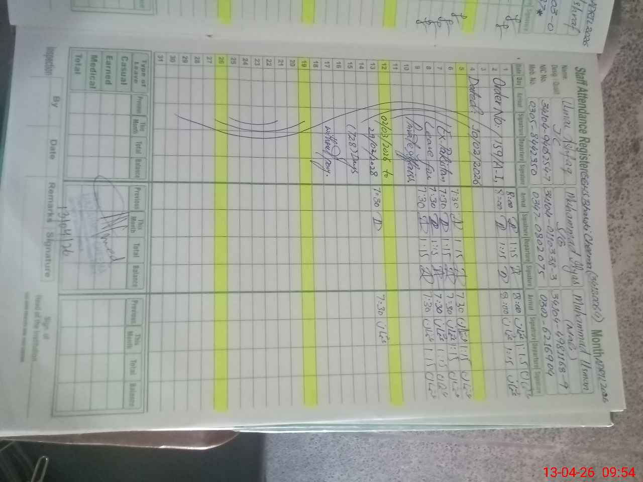| CNIC | Full Name | Designation | R/C | Absence During Last Calender Month |
