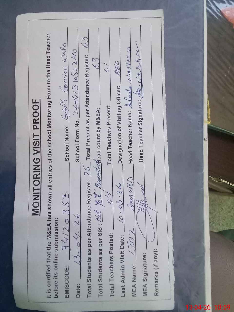 | Attendance Register | Head Teacher | MEA with School | Visit Proof |
