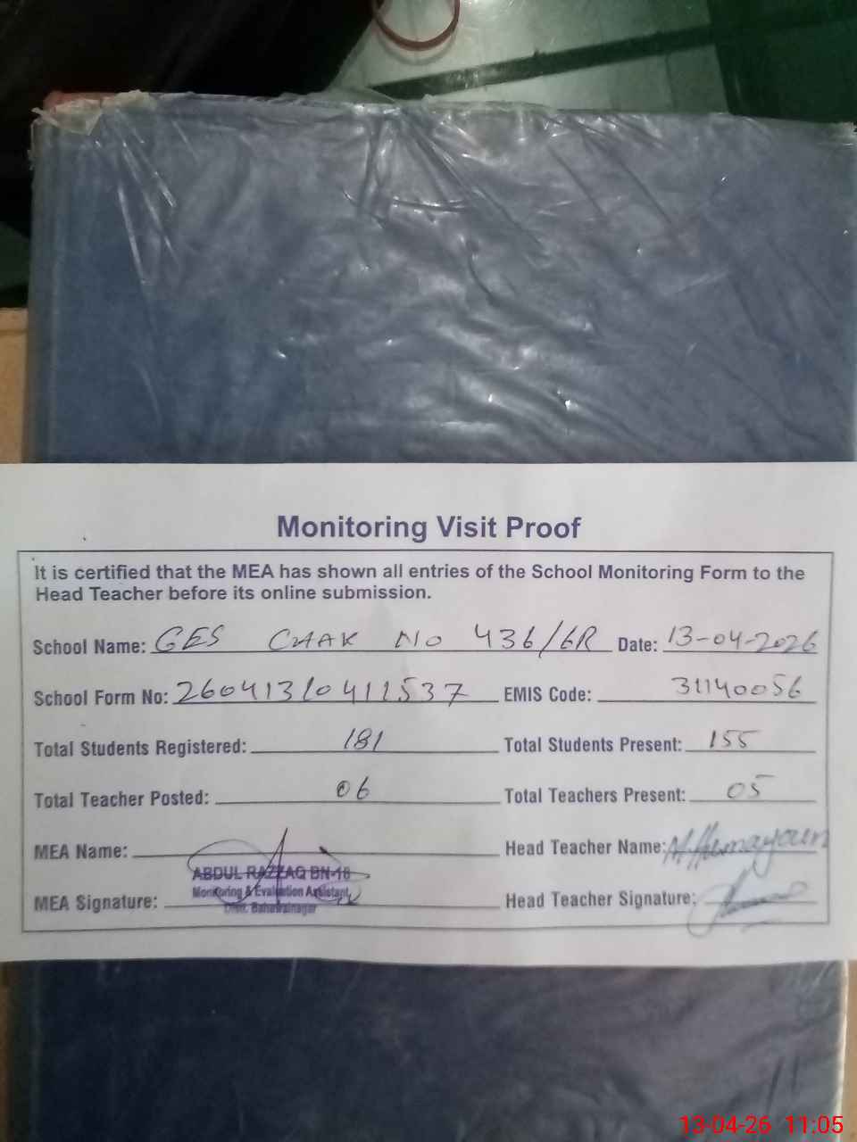 | Attendance Register | Head Teacher | MEA with School | Visit Proof |