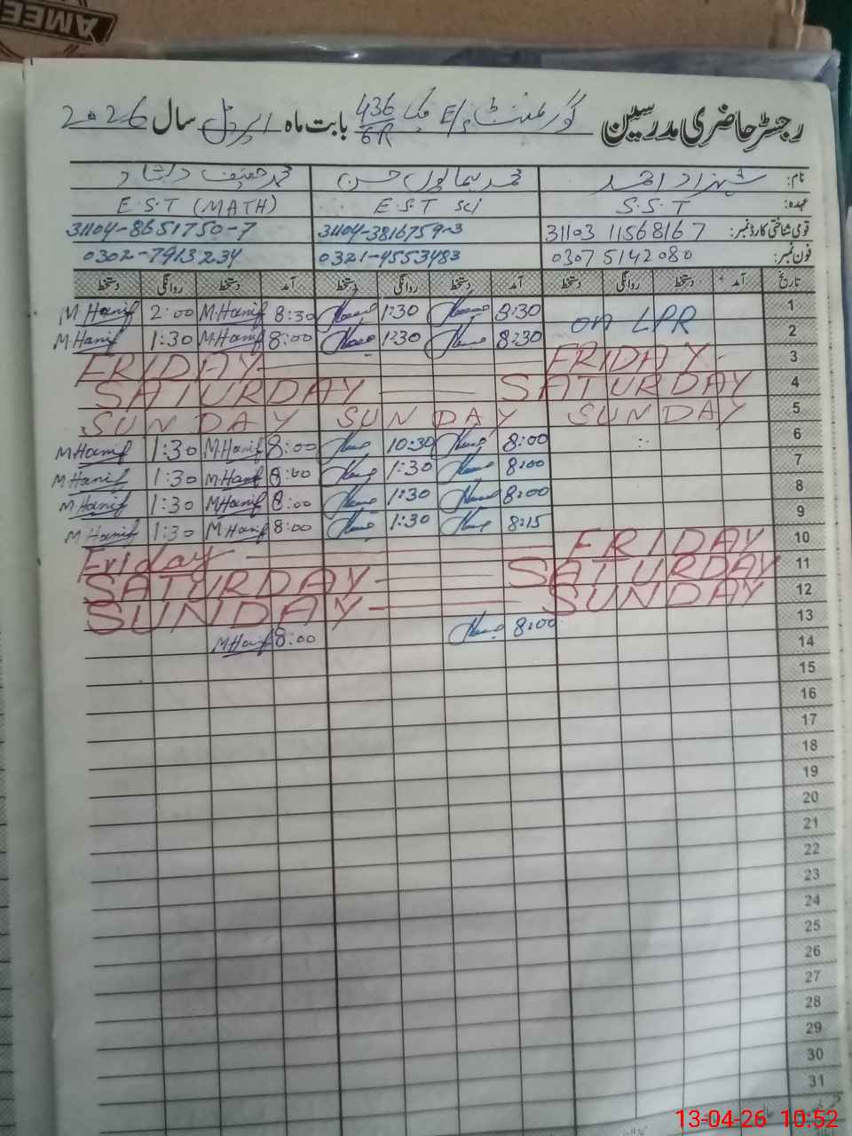 | 31**** | Sh**** Me**** | PST Science/Maths | Regular | 0 | 0 | 0 | 0 | 0 | 0 | 0 | 0 | 0 | Exam Duty |