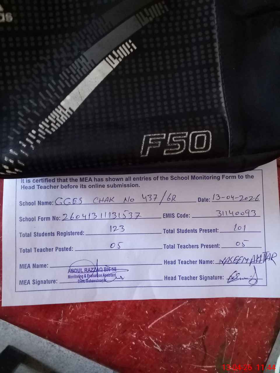 | Attendance Register | Head Teacher | MEA with School | Visit Proof |