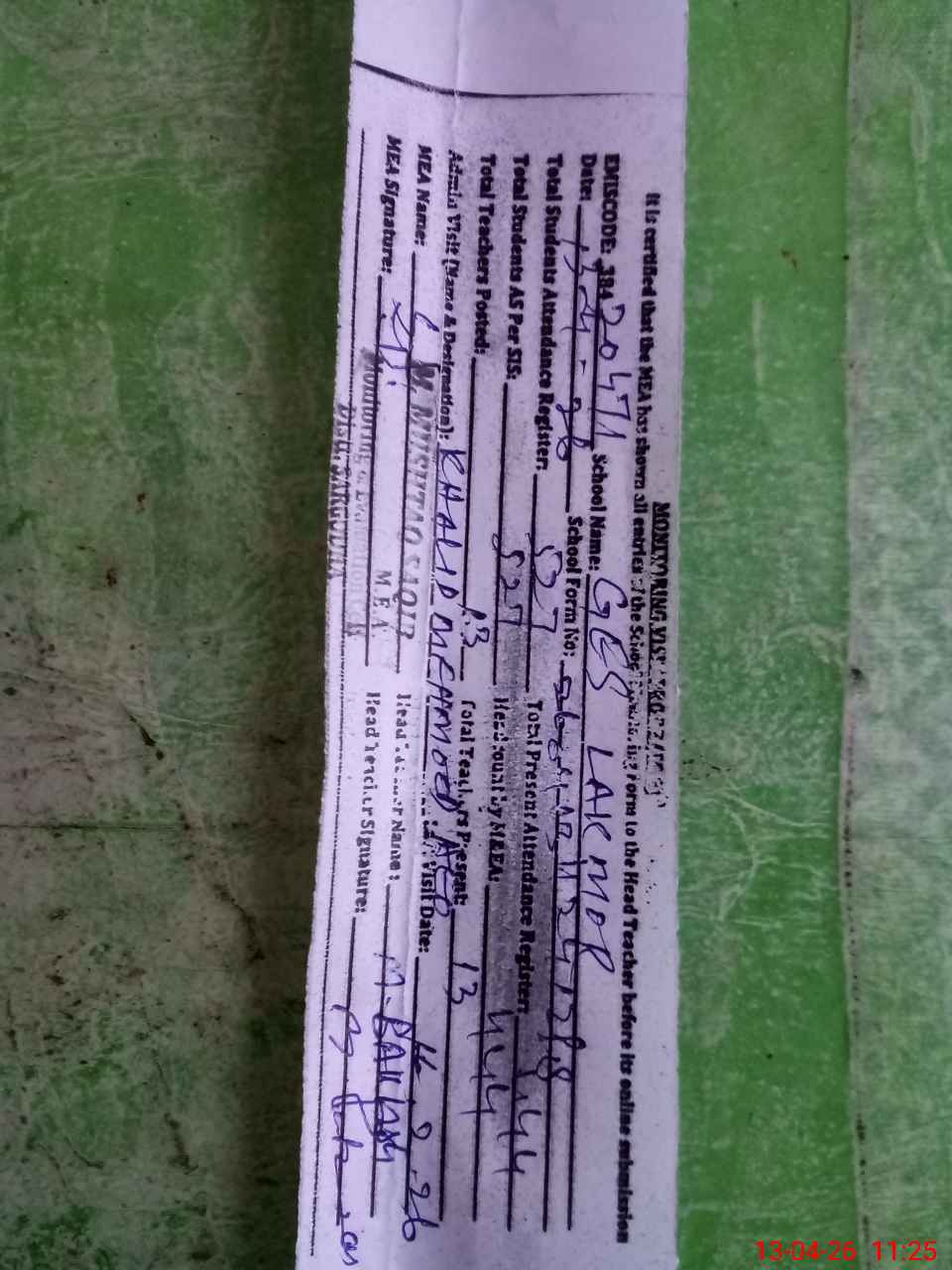| Attendance Register | Head Teacher | MEA with School | Visit Proof |