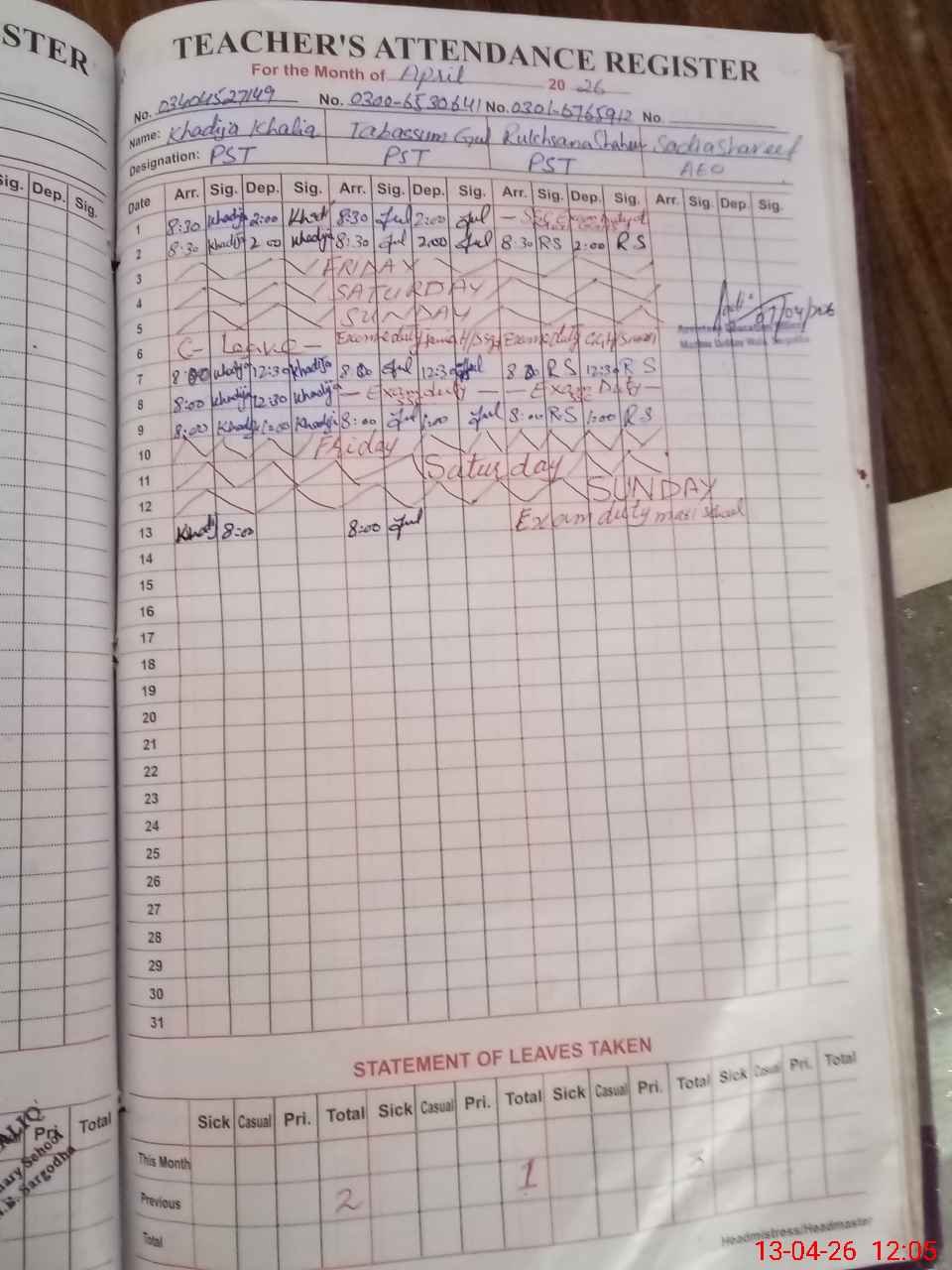 | Name: Kh**** Kh**** Designation: (School Headmaster's/Headmistress's) PST Phone/Cell Number: 03**** |