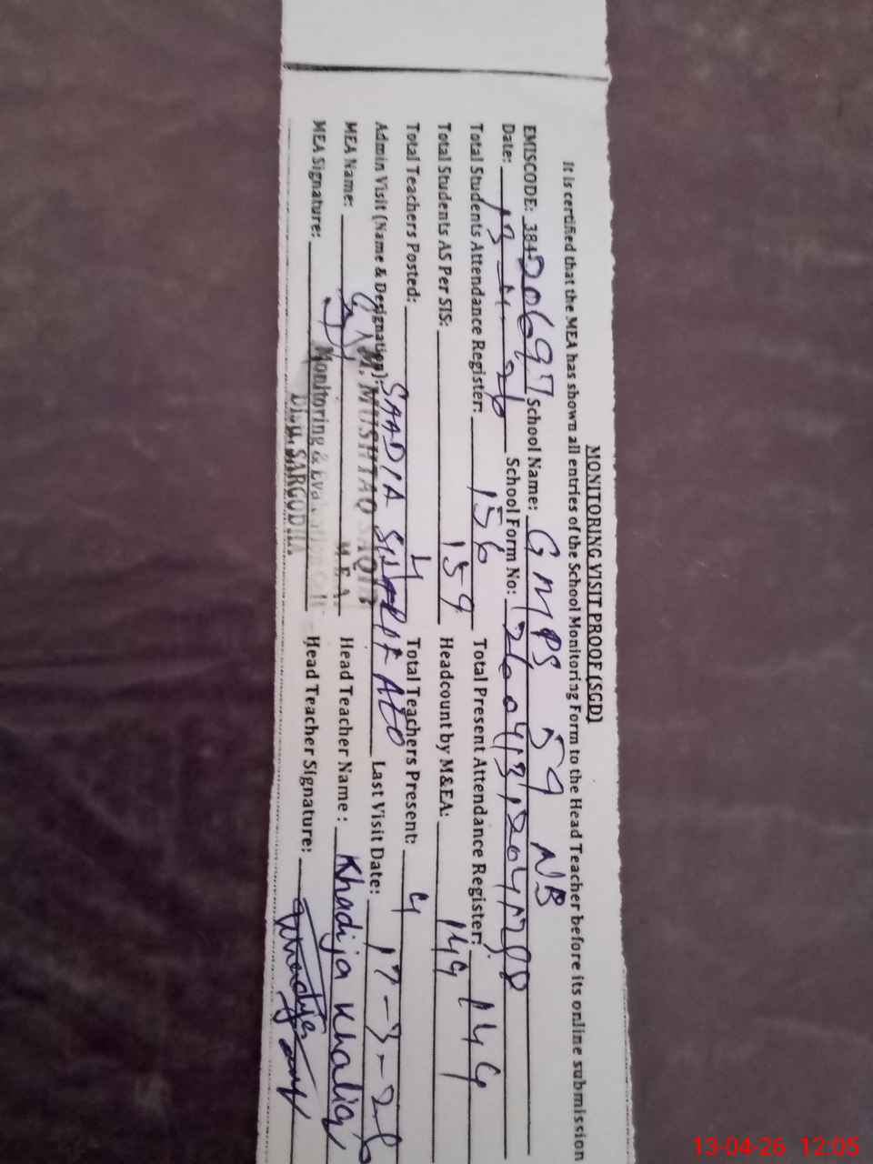 | Attendance Register | Head Teacher | MEA with School | Visit Proof |