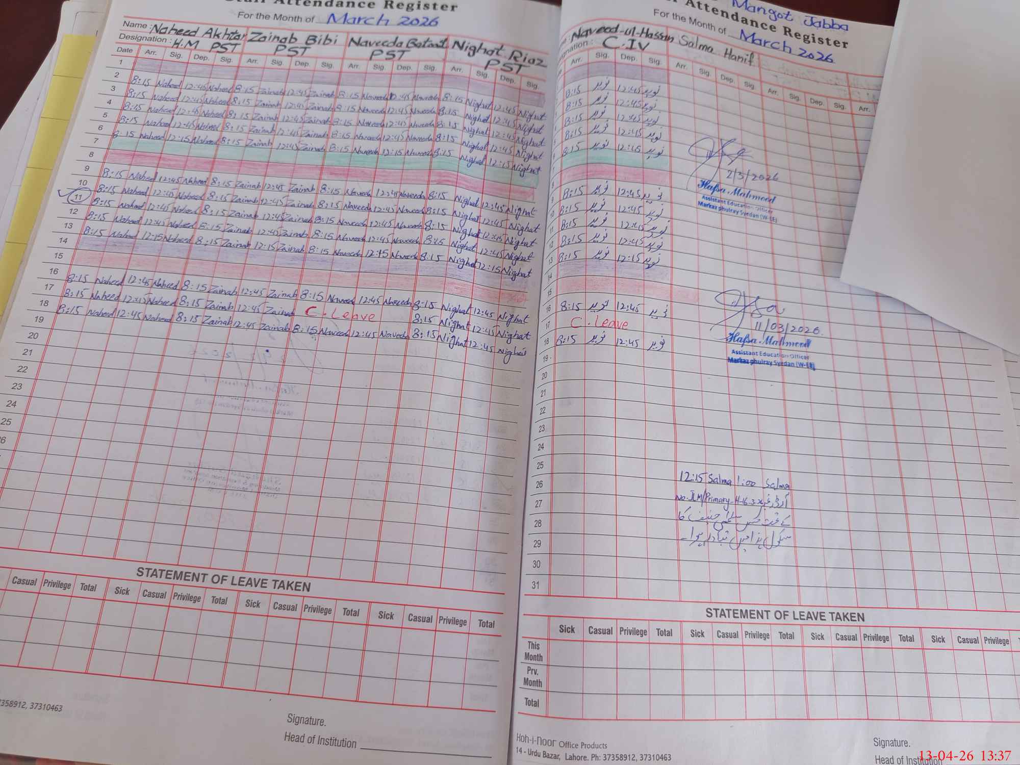 | Attendance Register | Head Teacher | MEA with School | Visit Proof |