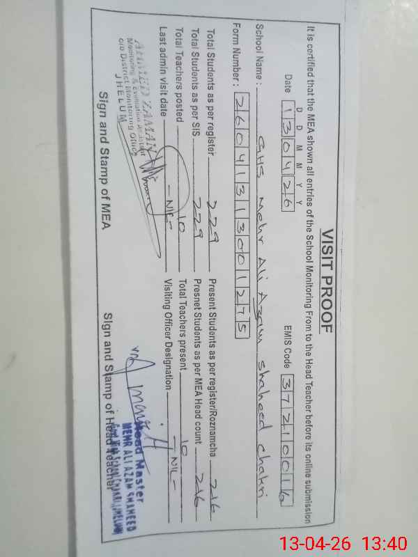| EMIS Code: 37210016 | Name of School: GHS MEHR ALI AZAM SHAHEED (CHAKRI) | |||