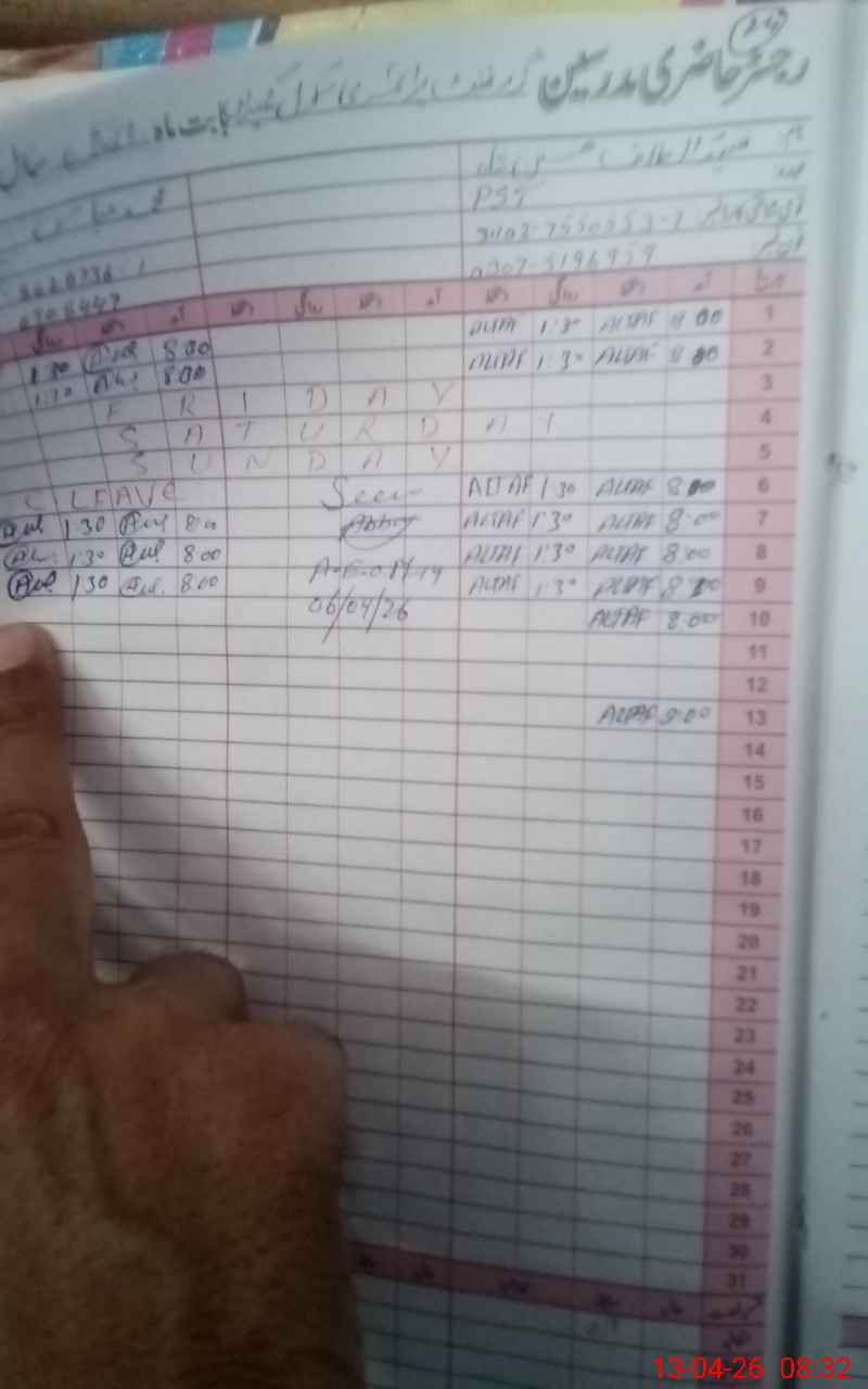 | CNIC | Full Name | Designation | R/C | Absence During Last Calender Month |