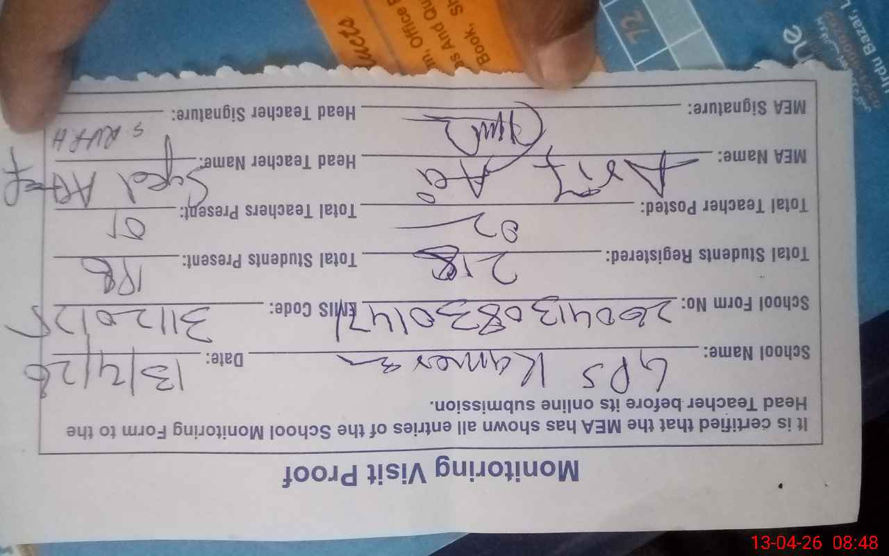 | Attendance Register | Head Teacher | MEA with School | Visit Proof |