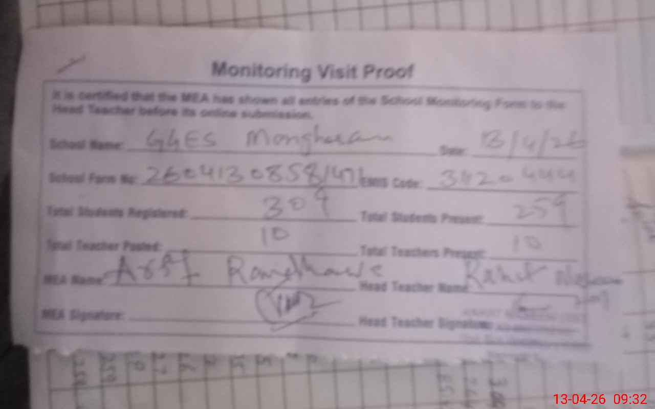 | Attendance Register | Head Teacher | MEA with School | Visit Proof |
