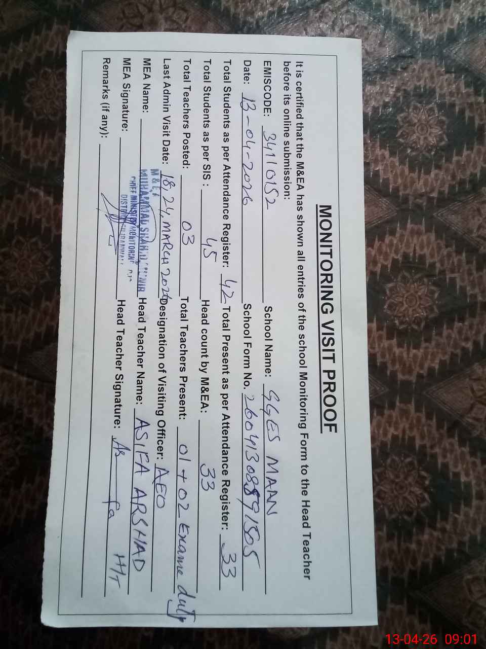 | Attendance Register | Head Teacher | MEA with School | Visit Proof |