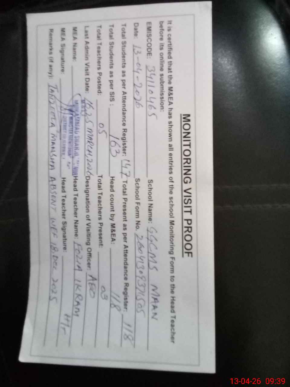 | Attendance Register | Head Teacher | MEA with School | Visit Proof |