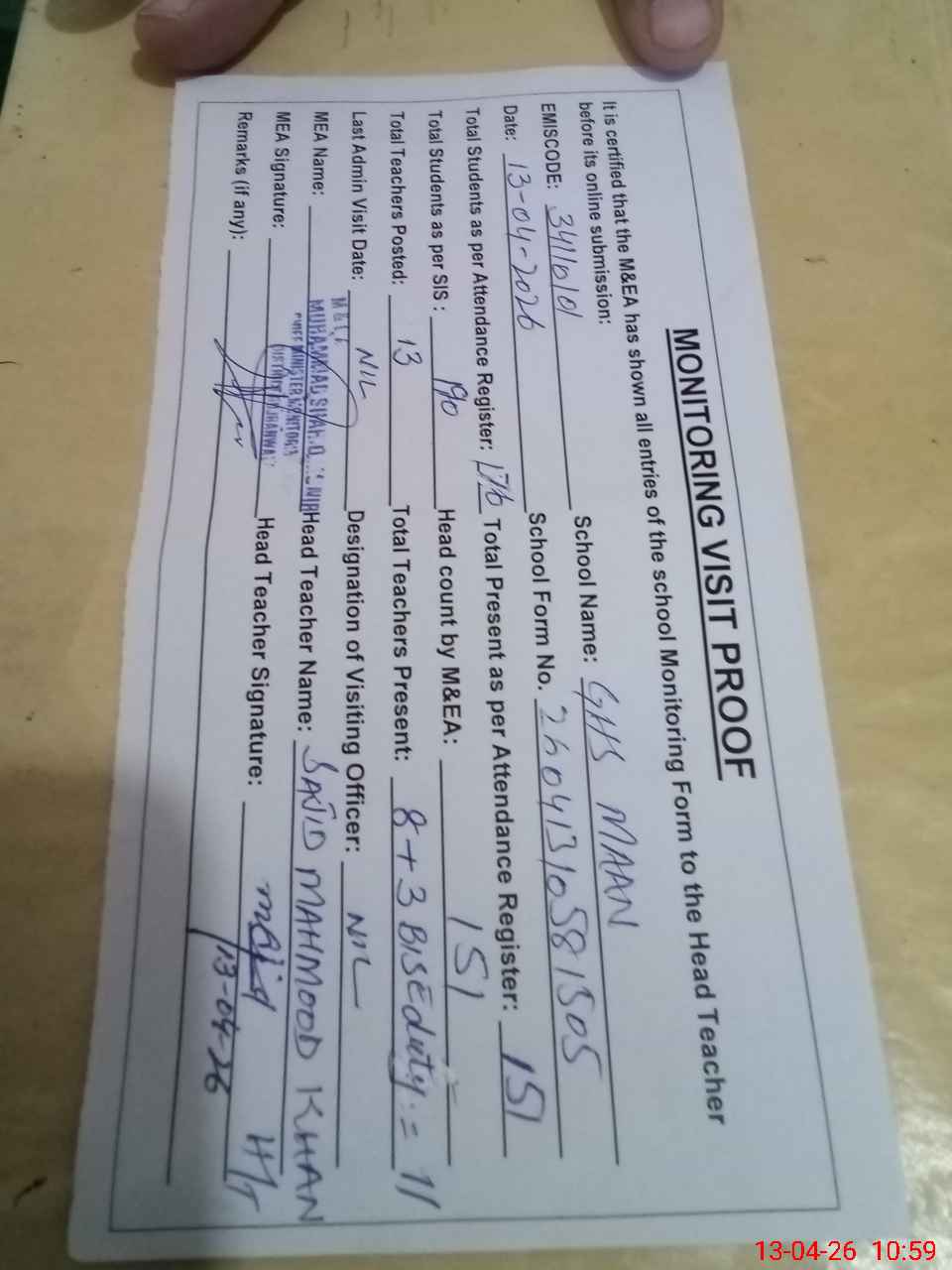 | Attendance Register | Head Teacher | MEA with School | Visit Proof |