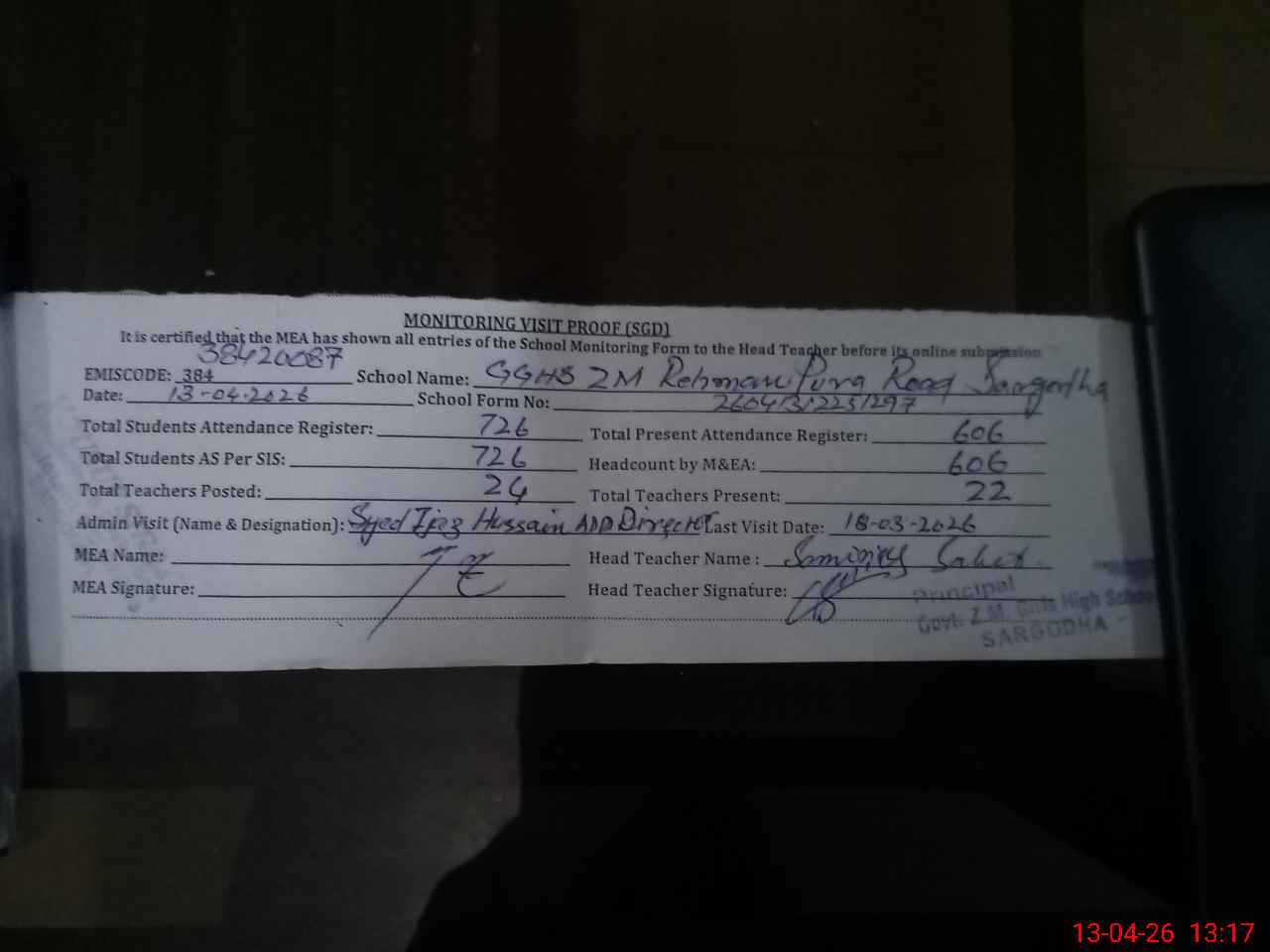 | Attendance Register | Head Teacher | MEA with School | Visit Proof |