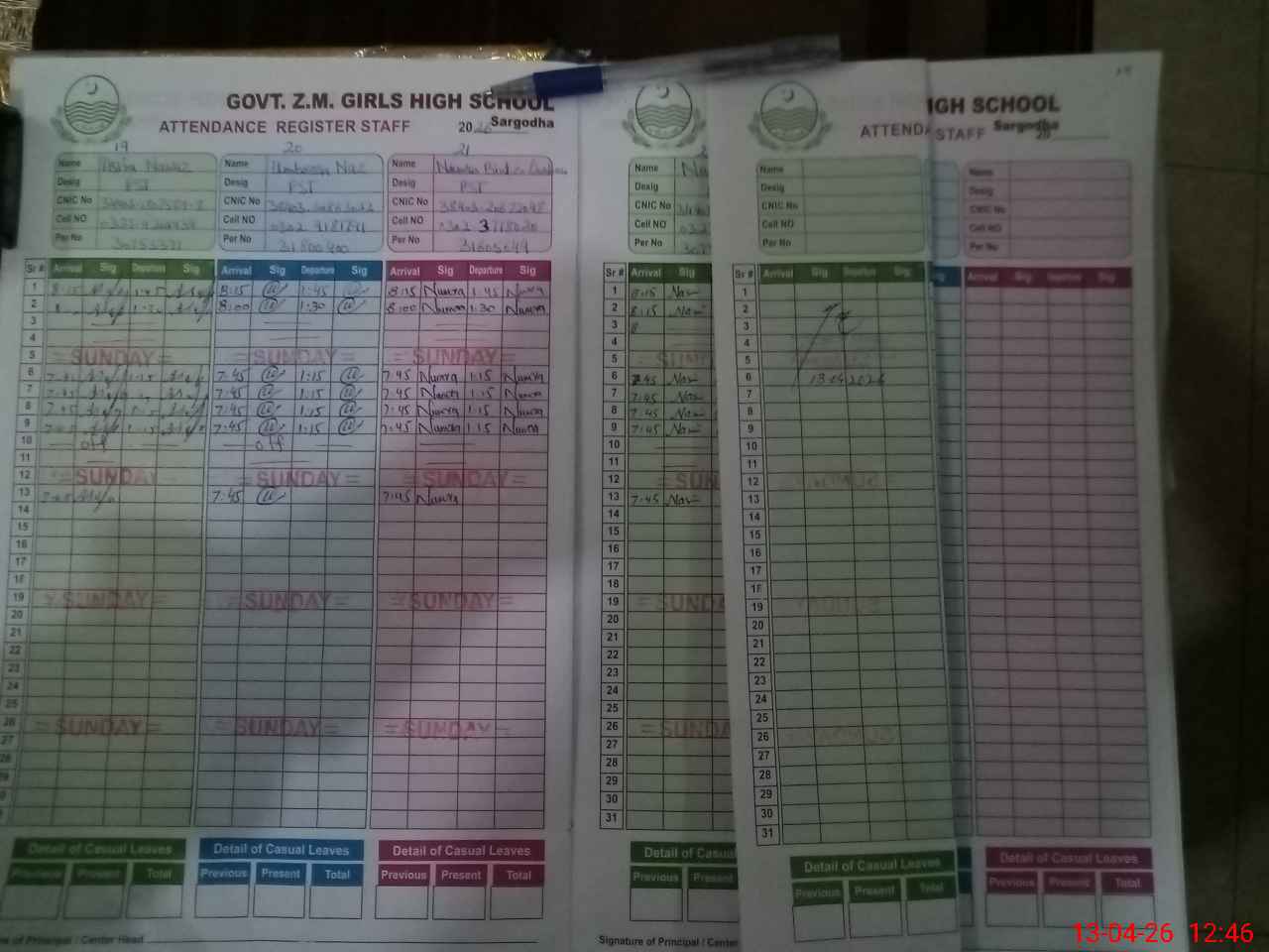 | CNIC | Full Name | Designation | R/C | Absence During Last Calender Month |