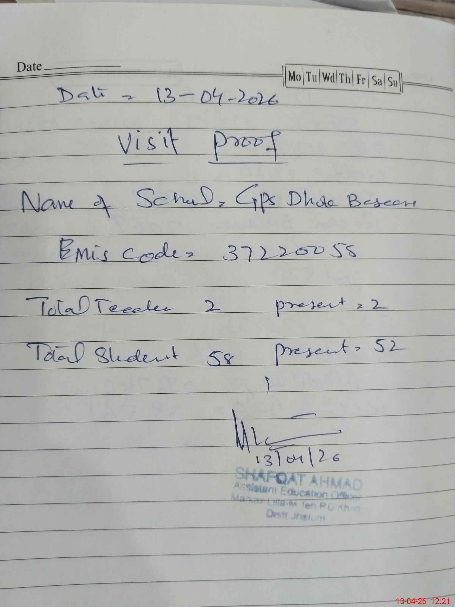 | Attendance Register | Head Teacher | MEA with School | Visit Proof |