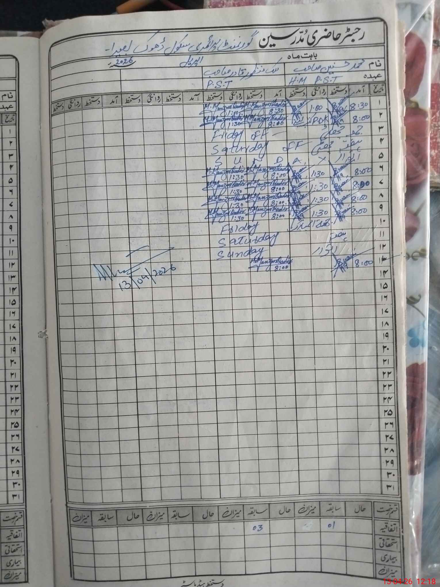 | CNIC | Full Name | Designation | R/C | Absence During Last Calender Month |