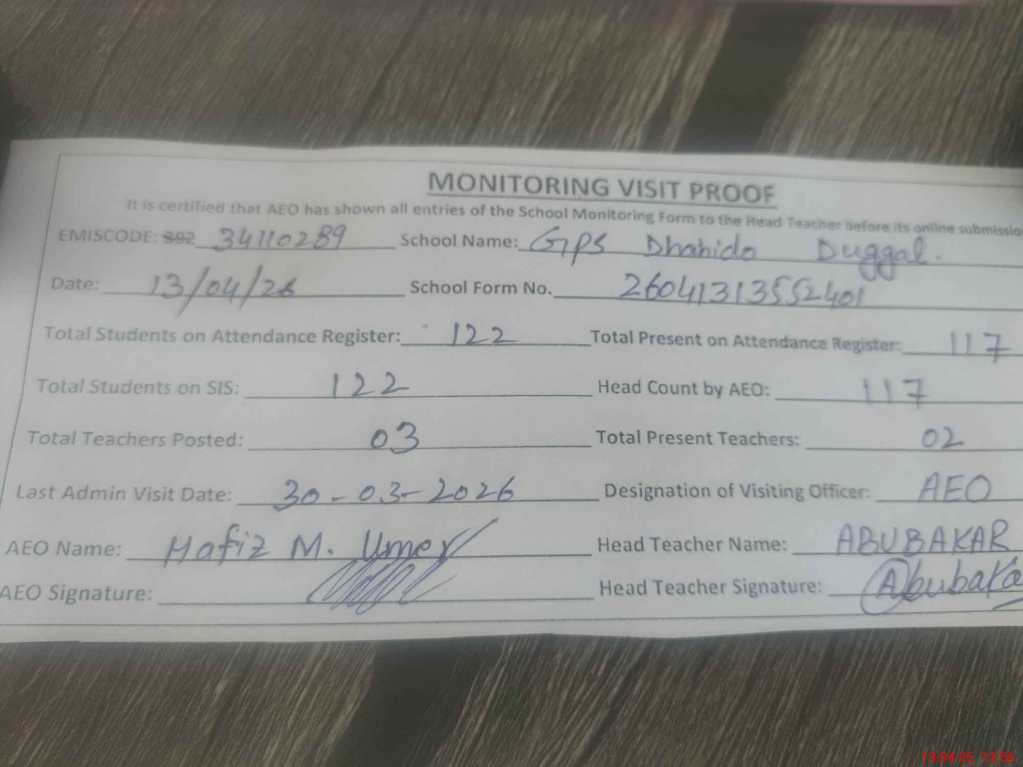 | EMIS Code: 34110289 | Name of School: GPS DHIDHO DUGGAL | |||