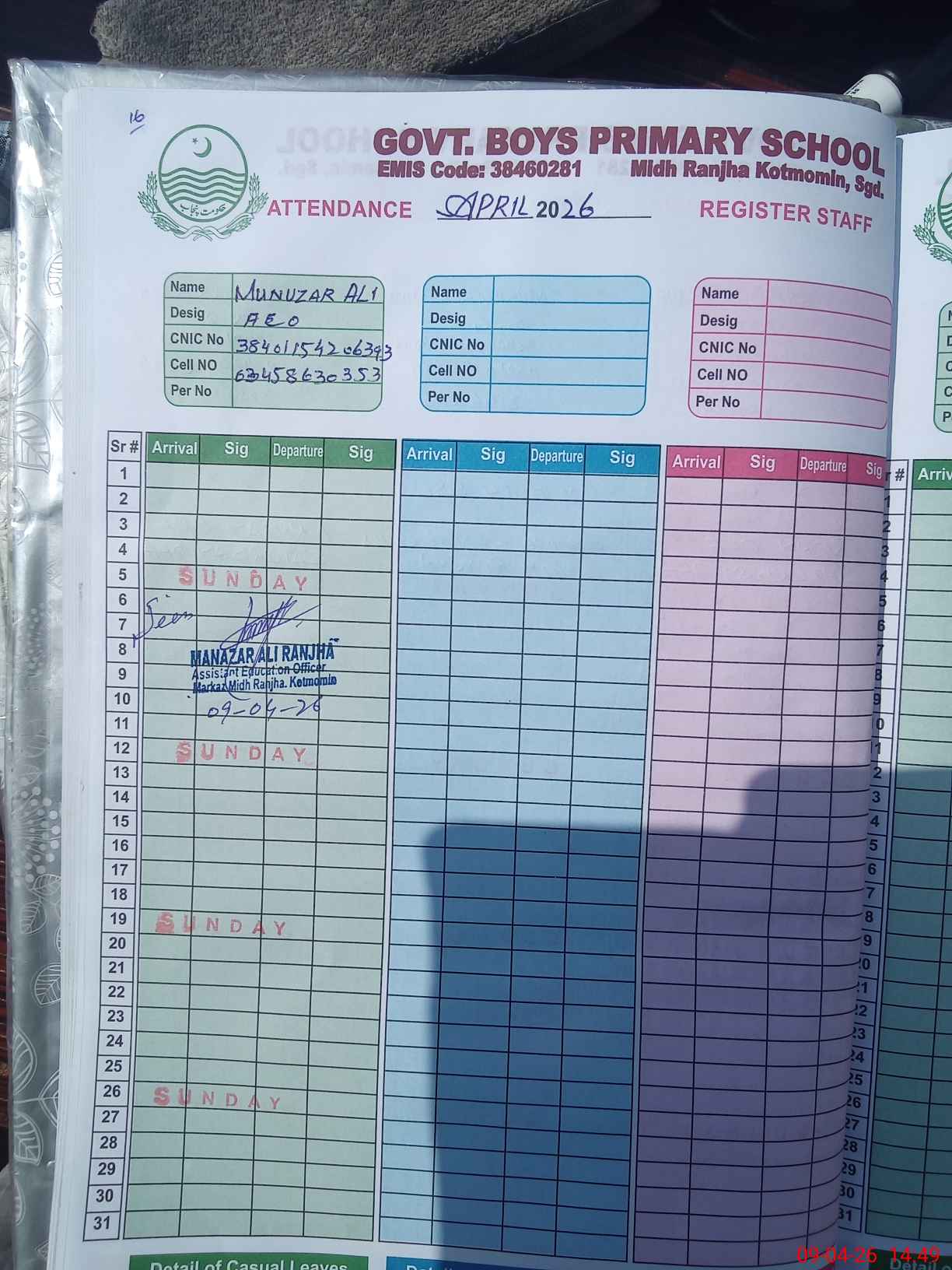| CNIC | Full Name | Designation | R/C | Absence During Last Calender Month |