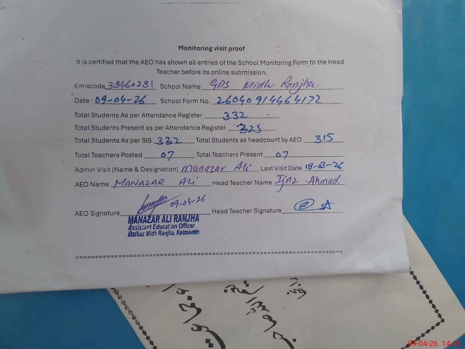 | EMIS Code: 38460281 | Name of School: GPS MIDH RANJHA | |||
