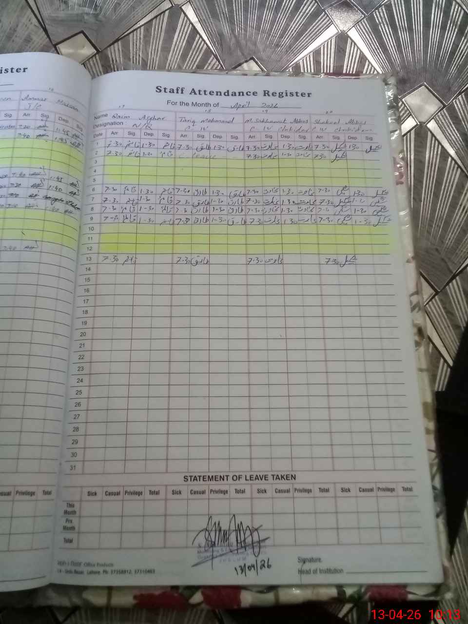 | CNIC | Full Name | Designation | R/C | Absence During Last Calender Month |