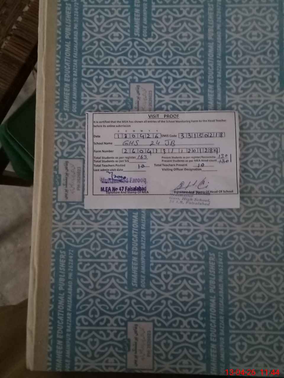 | Attendance Register | Head Teacher | MEA with School | Visit Proof |