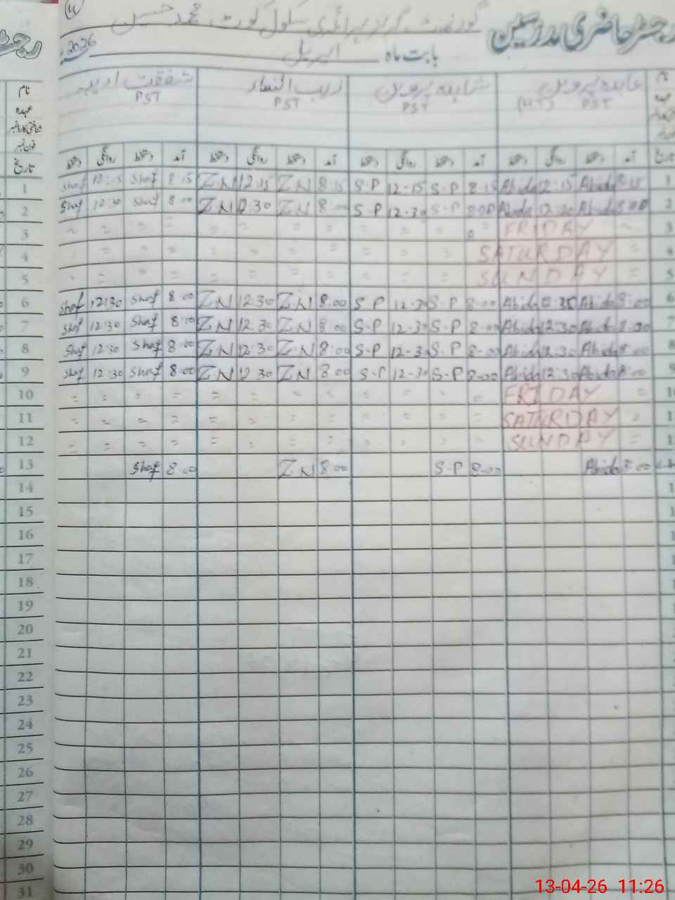 | CNIC | Full Name | Designation | R/C | Absence During Last Calender Month |