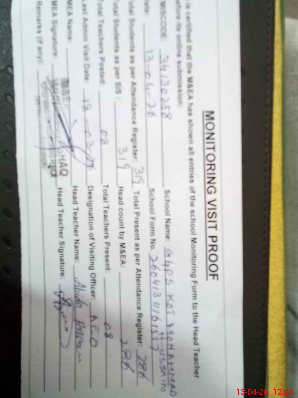 | Attendance Register | Head Teacher | MEA with School | Visit Proof |