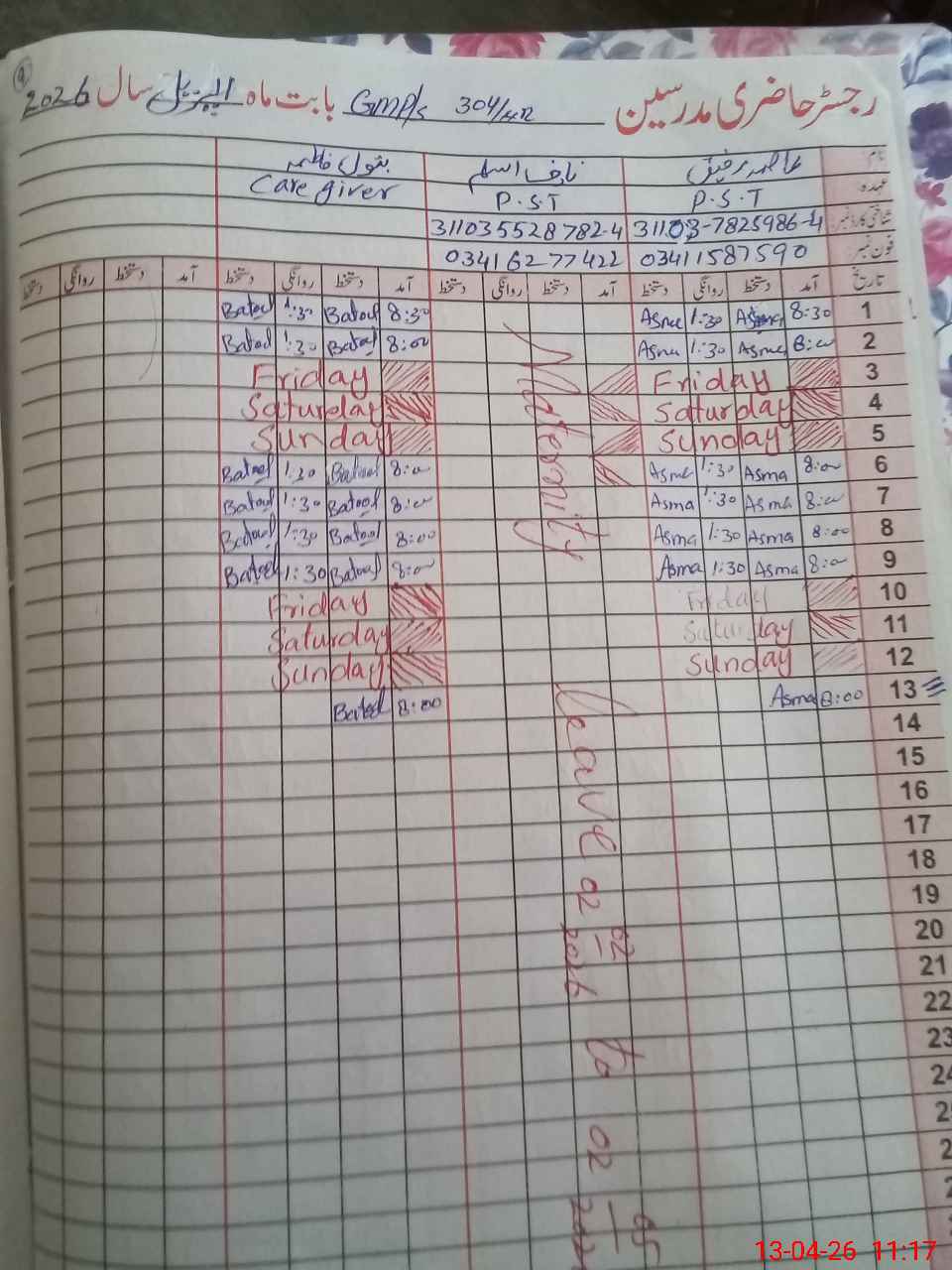 | Leave | Duty | Absent | Maternity | Medical | Ex- Pak |