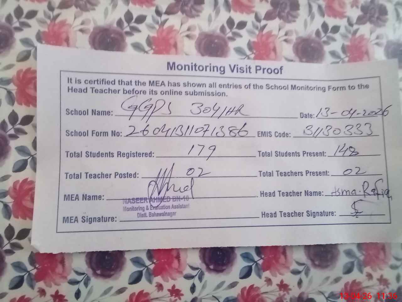| Attendance Register | Head Teacher | MEA with School | Visit Proof |