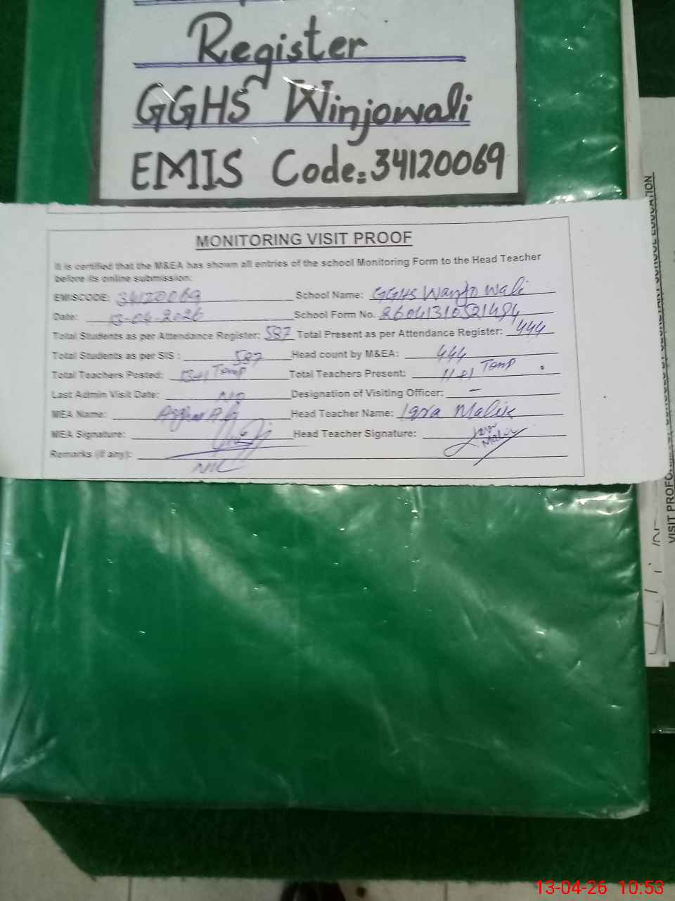 | Attendance Register | Head Teacher | MEA with School | Visit Proof |