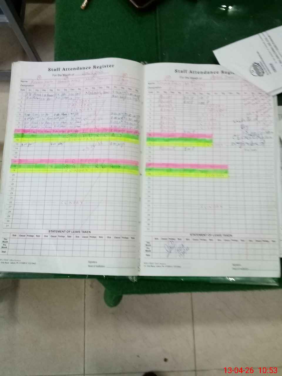| CNIC | Full Name | Designation | R/C | Absence During Last Calender Month |