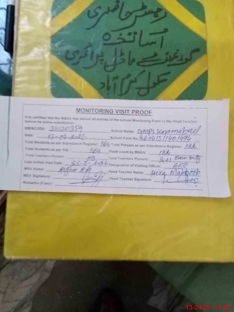 | Attendance Register | Head Teacher | MEA with School | Visit Proof |