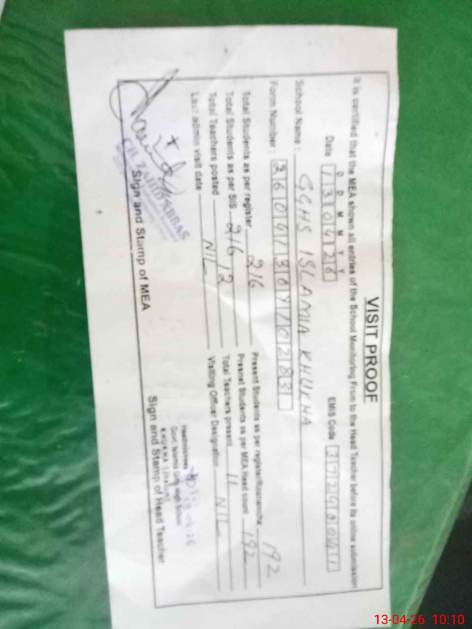 | Certified that this School was Inspected by the Undersigned MEA/DMO Today and the Information Stated Above is as Per Record. | |||||