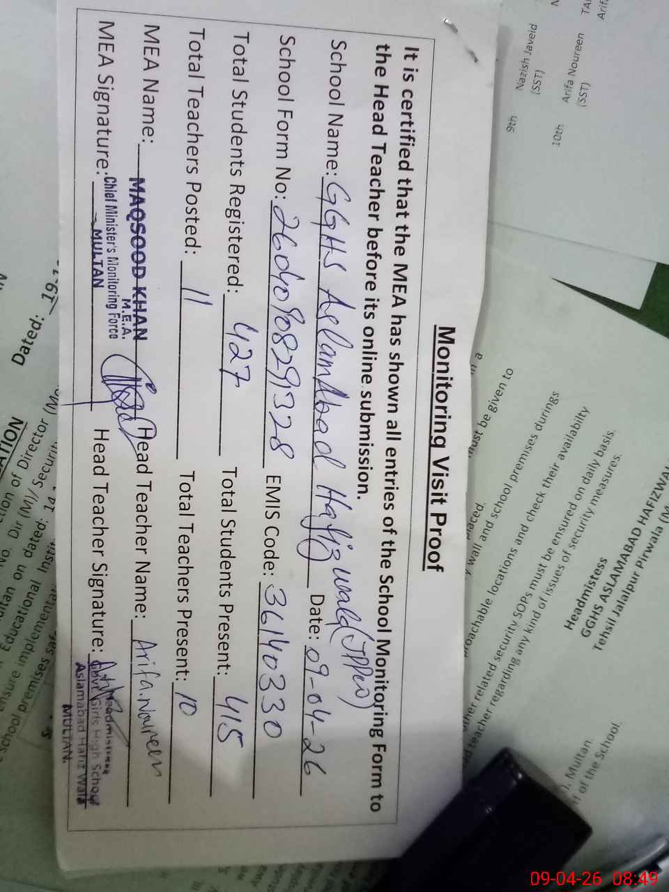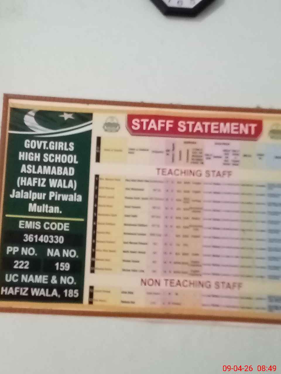 | EMIS Code: 36140330 | Name of School: GGHS ASLAM ABAD (HAFIZ WALA) | |||