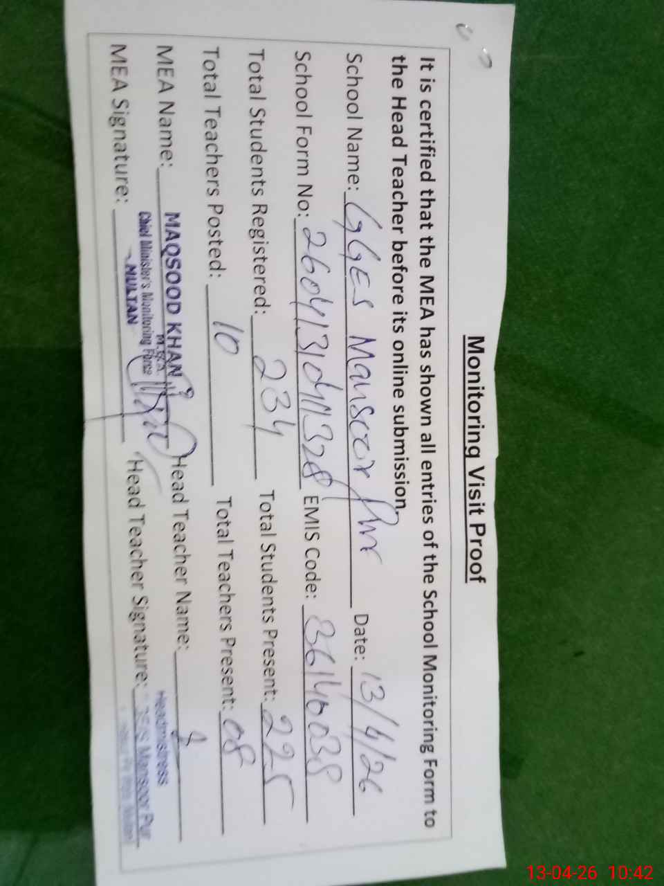 | Certified that this School was Inspected by the Undersigned MEA/DMO Today and the Information Stated Above is as Per Record. | |||||