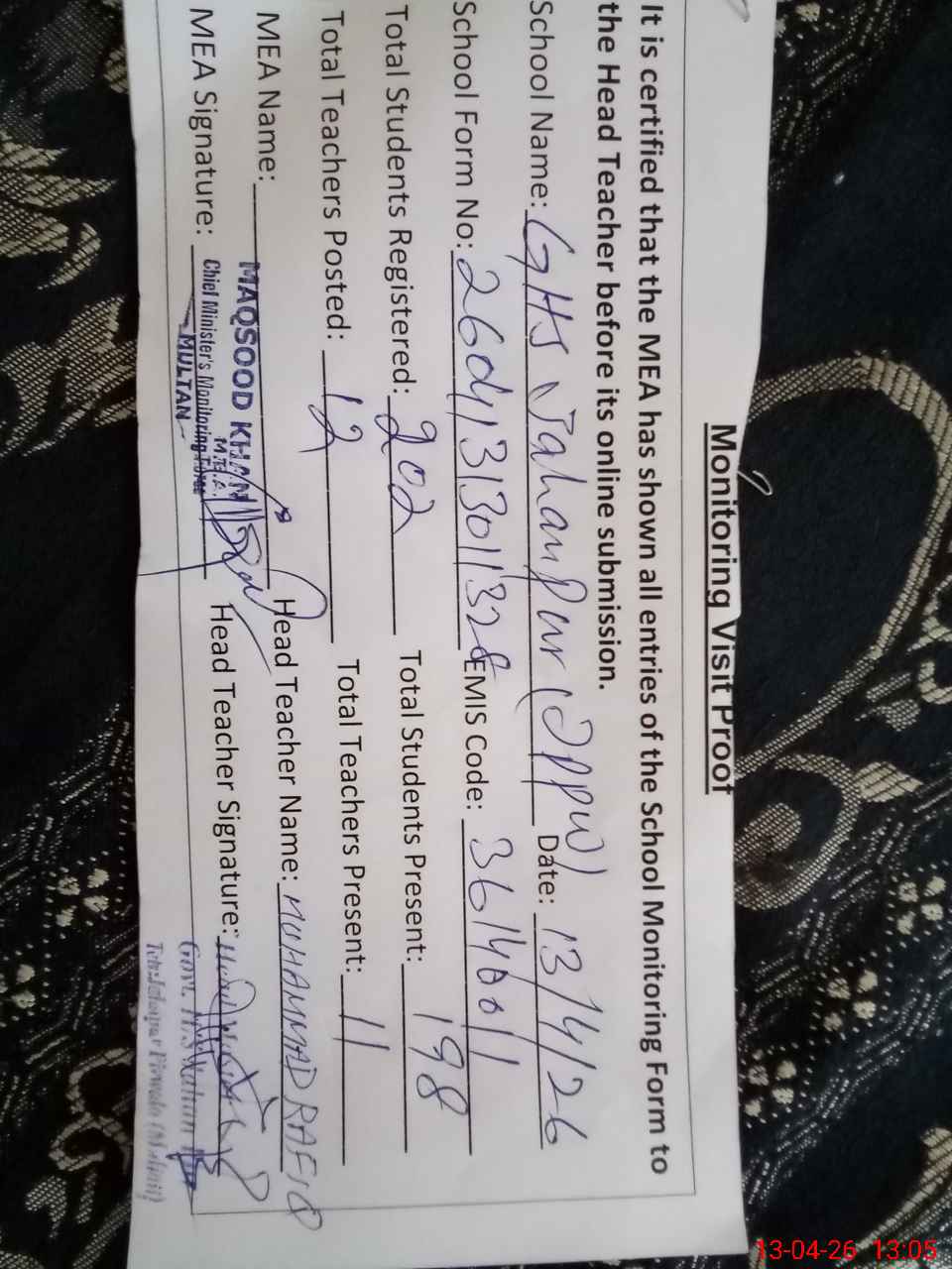 | Attendance Register | Head Teacher | MEA with School | Visit Proof |
