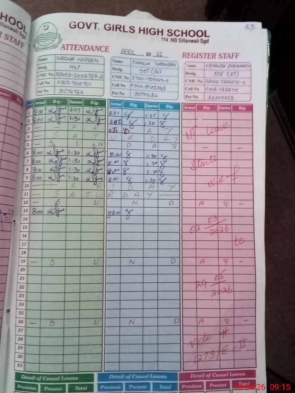 | CNIC | Full Name | Designation | R/C | Absence During Last Calender Month |