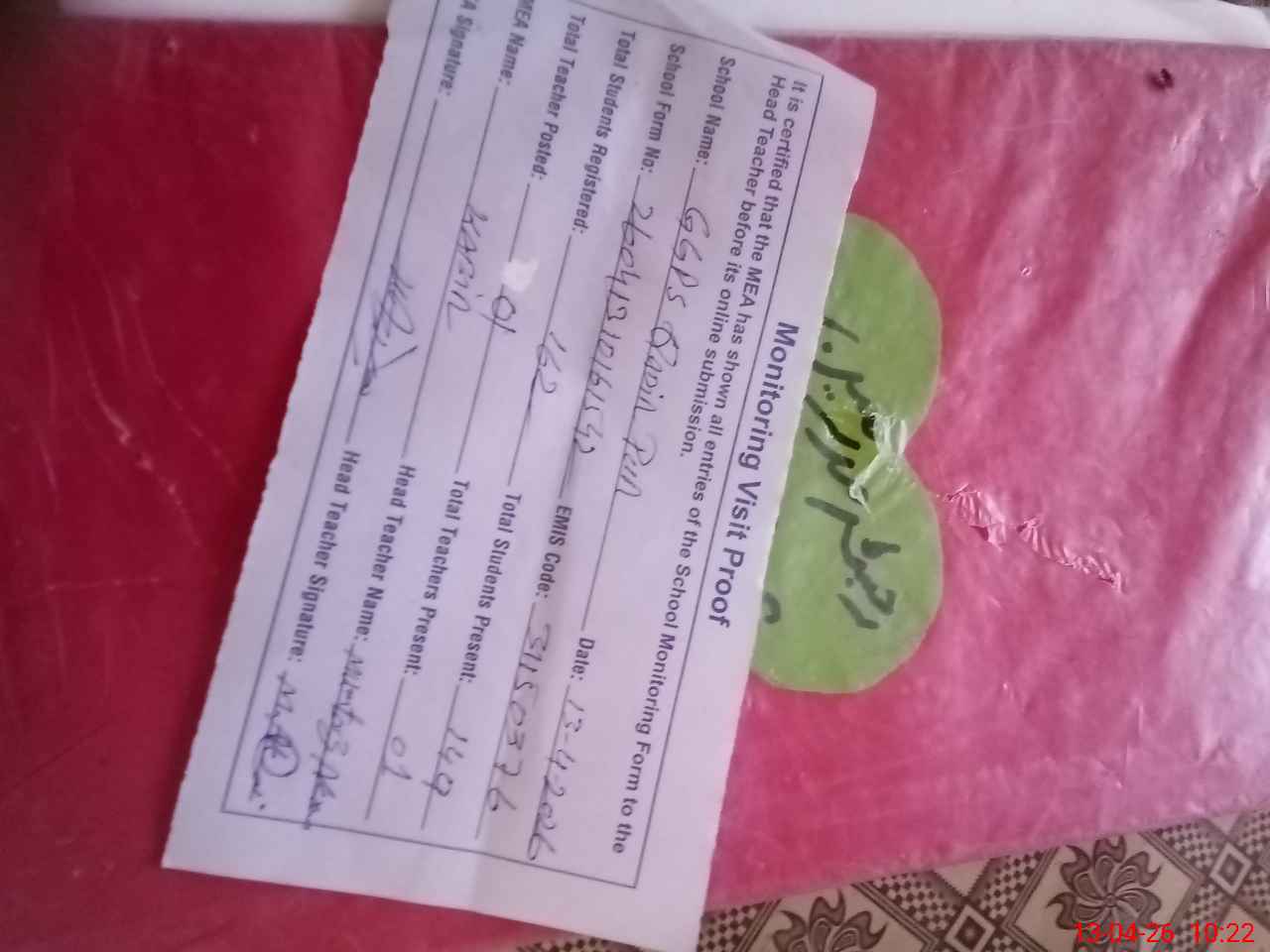 | Attendance Register | Head Teacher | MEA with School | Visit Proof |