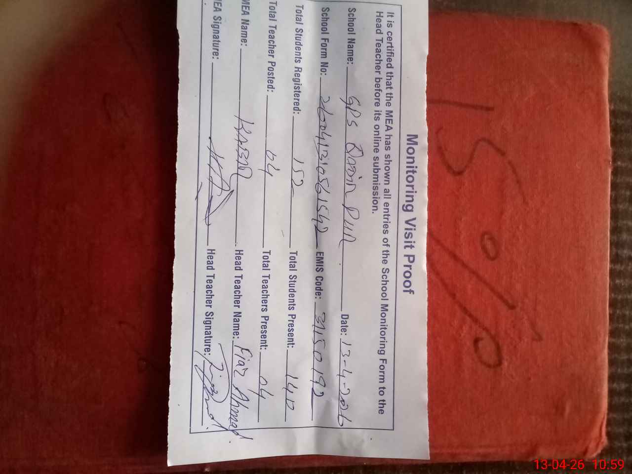 | Attendance Register | Head Teacher | MEA with School | Visit Proof |