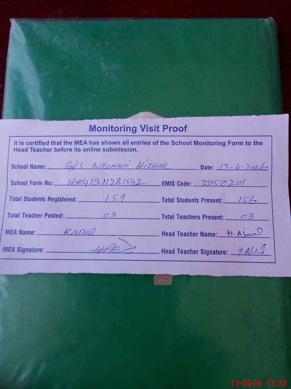 | Attendance Register | Head Teacher | MEA with School | Visit Proof |