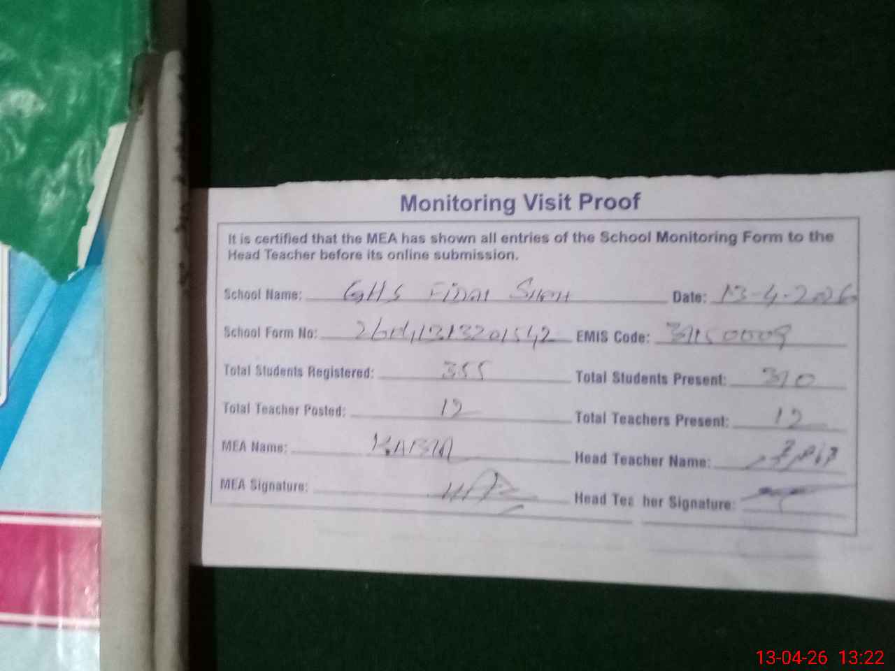 | Attendance Register | Head Teacher | MEA with School | Visit Proof |