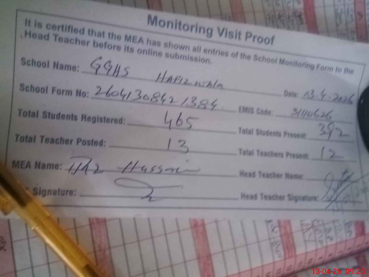 | EMIS Code: 31110626 | Name of School: GGHS HAFIZ WALA | |||