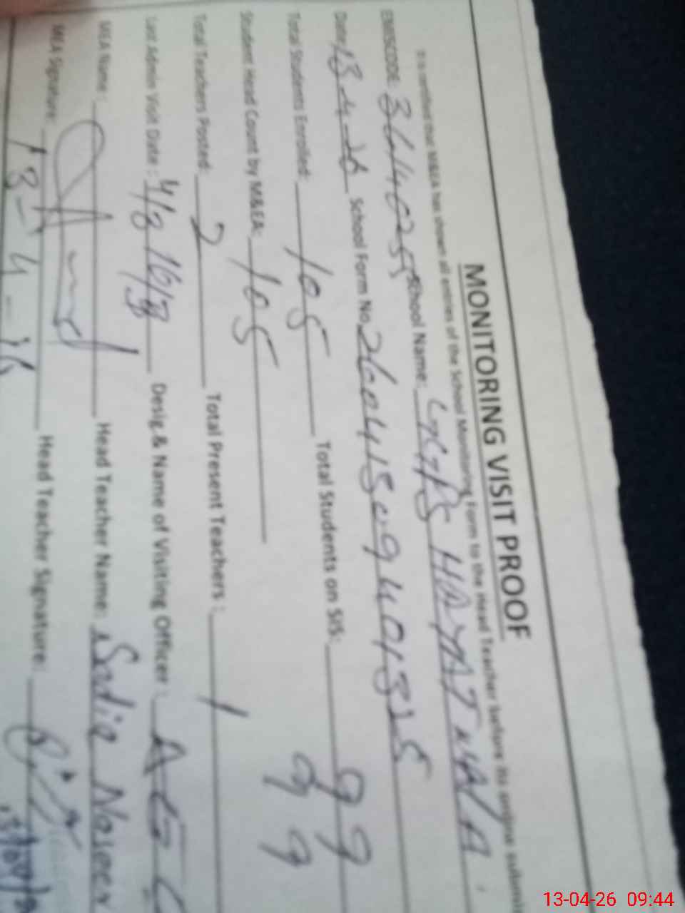 | Attendance Register | Head Teacher | MEA with School | Visit Proof |