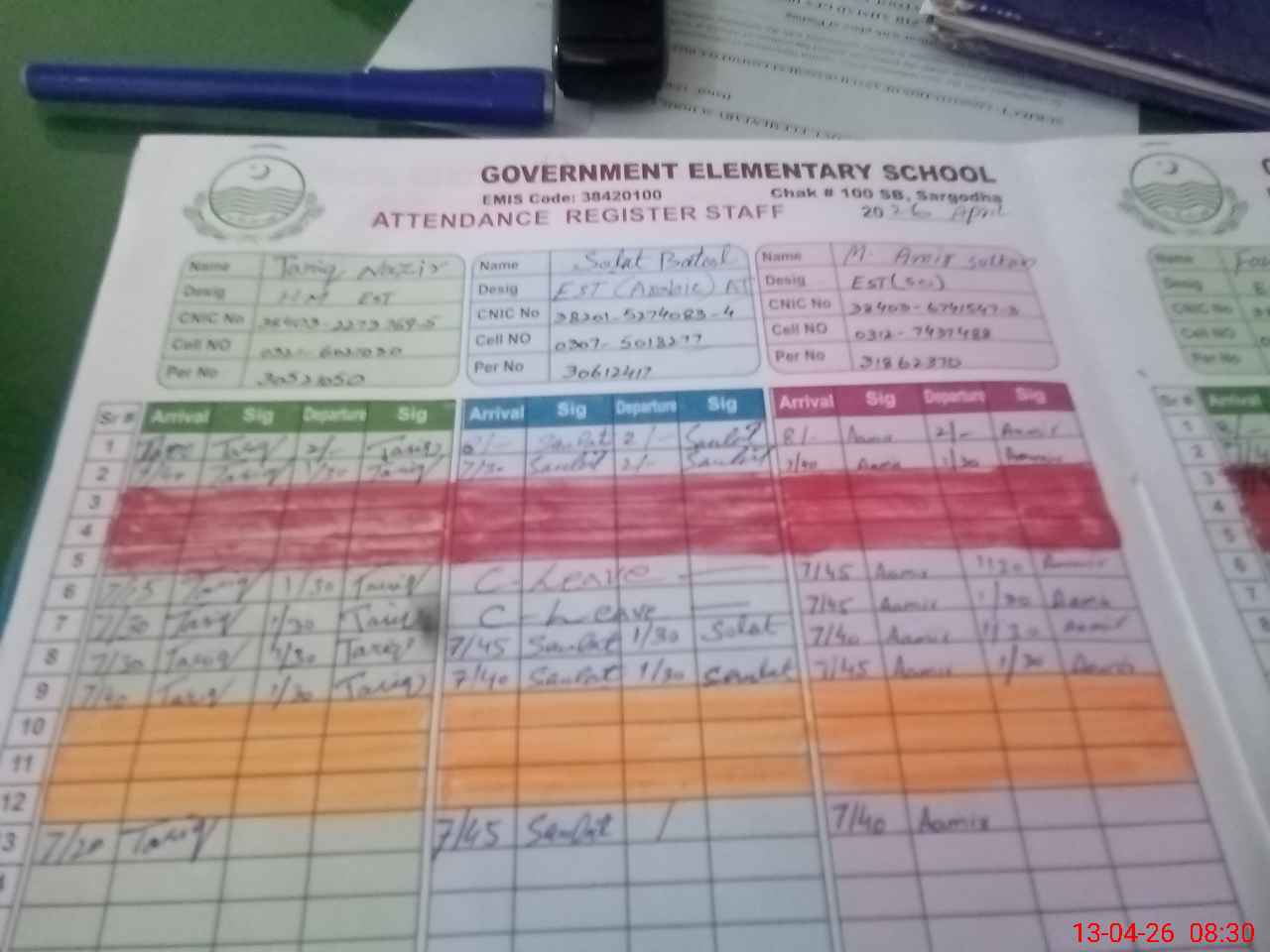 | CNIC | Full Name | Designation | R/C | Absence during last cal. month |