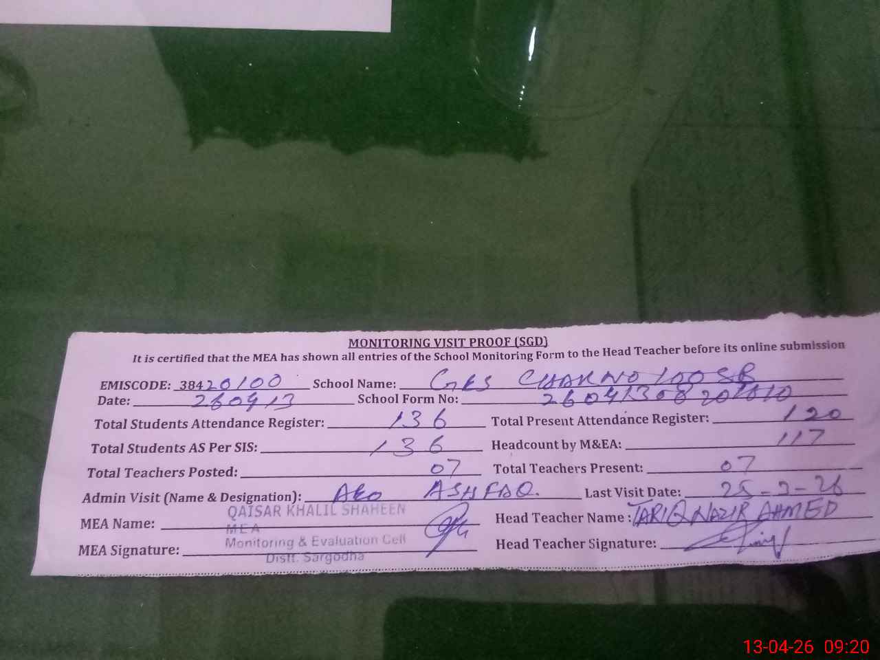 | Attendance Register | Head Teacher | MEA with School | Visit Proof |