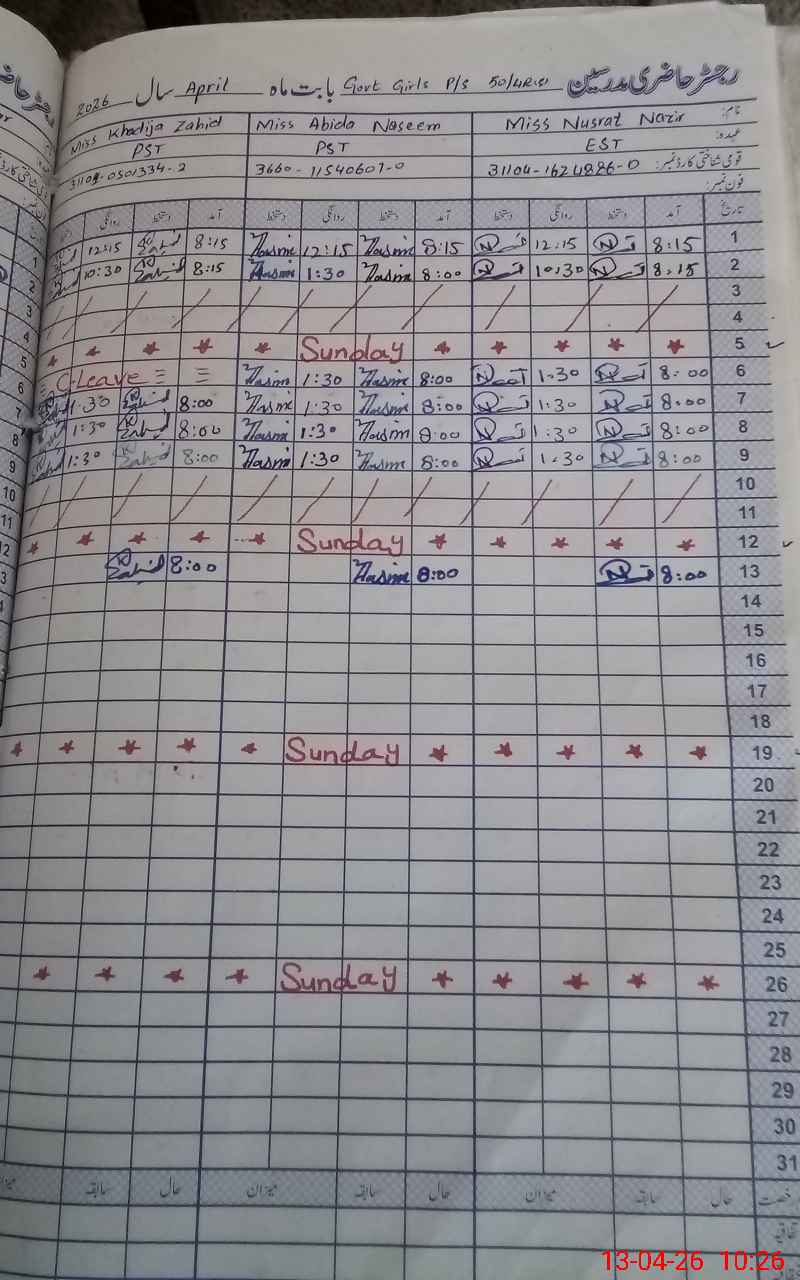 | CNIC | Full Name | Designation | R/C | Absence During Last Calender Month |