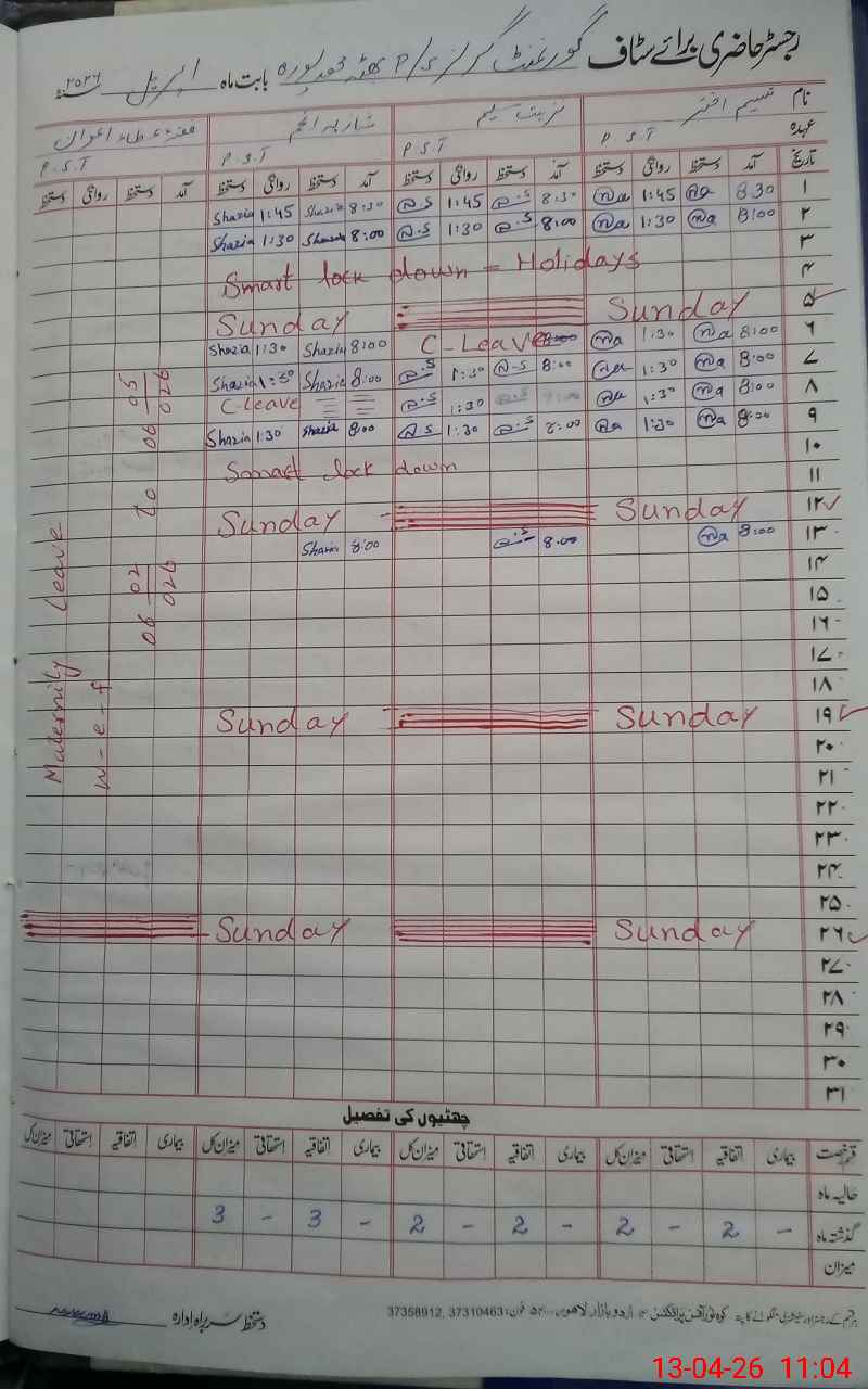 | CNIC | Full Name | Designation | R/C | Absence During Last Calender Month |