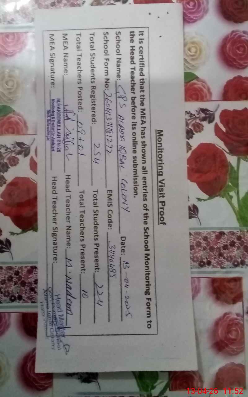 | EMIS Code: 31140485 | Name of School: GPS ALLAMA IQBAL COLONY | |||