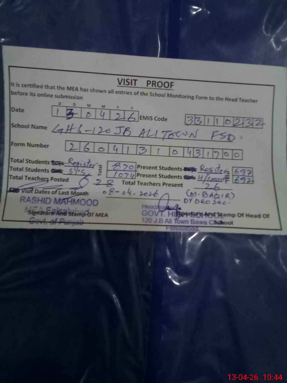| EMIS Code: 33110232 | Name of School: GHS 120 JB ALI TOWN FSD | |||