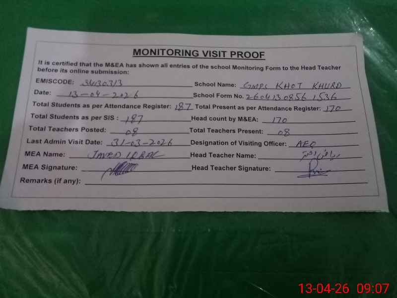 | EMIS Code: 34130313 | Name of School: GMPS KHOT KHURD | |||